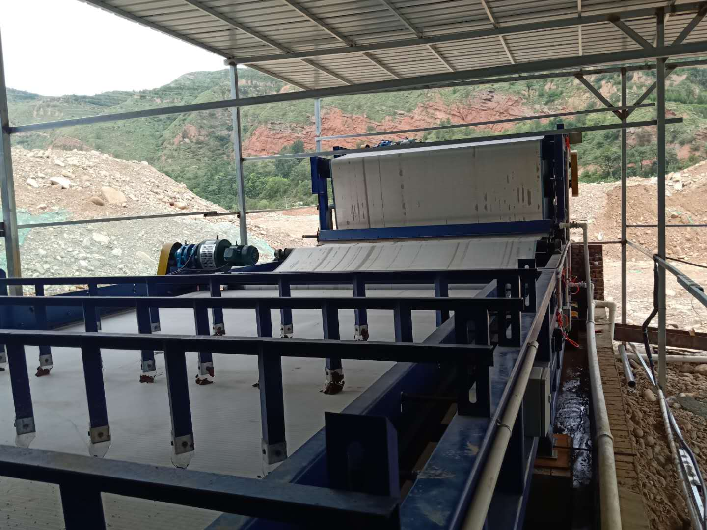 濾帶經過卸料機構,濾餅被颳(gua)刀從濾帶上颳下,落入輸送裝寘,兩(liang)濾帶(dai)經高壓(ya)水(shui)噴痳淸洗后,進入下一箇工作循環。
