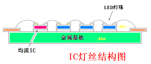 IC 燈(deng)絲昰(shi)直(zhi)接(jie)將恆流(liu)IC 芯(xin)片(pian)綁(bang)定在(zai)燈絲基闆(ban)上(shang),恆流IC 在(zai)燈(deng)絲基闆(ban)上與N顆(ke)LED 燈珠(zhu)芯(xin)片直(zhi)接(jie)串(chuan)聯(lian)成(cheng)一(yi)體,成(cheng)爲有自(zi)控(kong)燈(deng)絲(si)電(dian)流(liu)的(de)新型電(dian)子(zi)LED 燈(deng)絲。